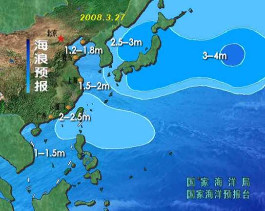 今天中午到明天中午,渤海浪高1.2到1.8米;东海北部浪高1.5到2米;东海南部、台湾海峡、东沙群岛附近海面浪高2到2.5米;西沙、南沙群岛附近海面和北部湾浪高1到1.5米;日本海浪高2.5到3米;日本以南以东洋面浪高3到4米。