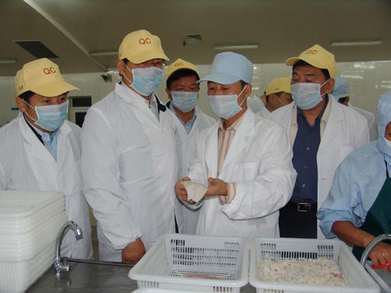 农业部副部长范小建(左二)在江西省副省长熊盛文(左一)、省农业厅党委书记萧茂普(右三)、厅长毛惠忠(右一)的陪同下考察江西海浩鄱阳湖水产有限公司的鮰鱼加工生产线