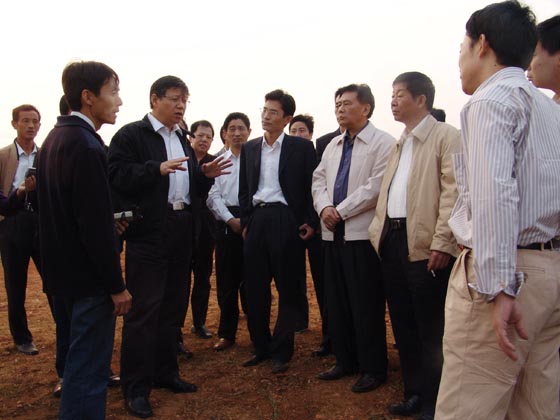 农业部副部长范小建(左三)、渔业局副局长崔利锋(左四)等一行考察余干县瑞洪镇镇郊村乌鱼(黄鳝)养殖基地