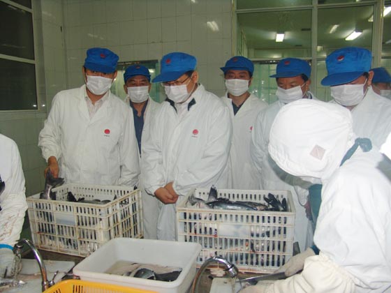 农业部副部长范小建(左三)一行考察江西省鄱阳湖农业综合开发有限公司的鮰鱼加工生产线