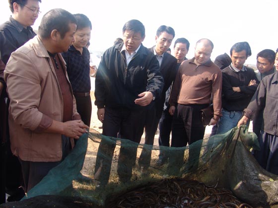 当日下午,范副部长一行不辞辛劳驱车前往鄱阳县的江西省珠湖水产有限公司珠湖鮰鱼养殖基地和位于该县城工业园区的江西省鄱阳湖农业综合开发有限公司进行考察。在珠湖鮰鱼养殖基地,公司总经理周志勇向范副部长汇报说:公司从2004年起先后引进、购买鮰鱼原种、亲本,自行繁育良种、培育鱼种;今年公司采取“五统一”的模式(即统一提供鱼苗、提供饲料、鱼病防治、生产标准和组织销售),按照群众投资25%、利润分成50%的合作方式进行水产开发。已建立起1个网箱养殖基地共1326个、3个网围养殖基地共1800亩和9个大鱼塘(小水库)养殖基地共2200亩。目前已进入捕捞旺季,产品全部按合同价供应加工企业。预计全年鮰鱼总产量达1500吨、产值1600万元、利润约400万元,平均每户增收3万元。范副部长详细地询问了鮰鱼养殖时间、饲料等情况,并饶有兴致地参观了投饲机投饲的过程。之后,范副部长一行来到由万向集团控股的浙江远洋渔业集团股份有限公司投资4000万元兴建的江西省鄱阳湖农业综合开发有限公司进行现场考察。该公司现有4条国内一流的水产品加工生产线,有员工1000余人,年加工生产能力达3500吨以上,配置了双螺旋超低温急冻设置及金属、农药残留检测仪等,于2004年先后通过了美国FDA和欧盟卫生注册,年创汇1000万美元以上。范副部长对原料鱼、加工各环节、最后到产品形成的全过程进行了考察,并不时地与公司负责人进行交流。他说,要大力扶持一批具有强带动力的龙头企业,只有这样才能带领农民增收。