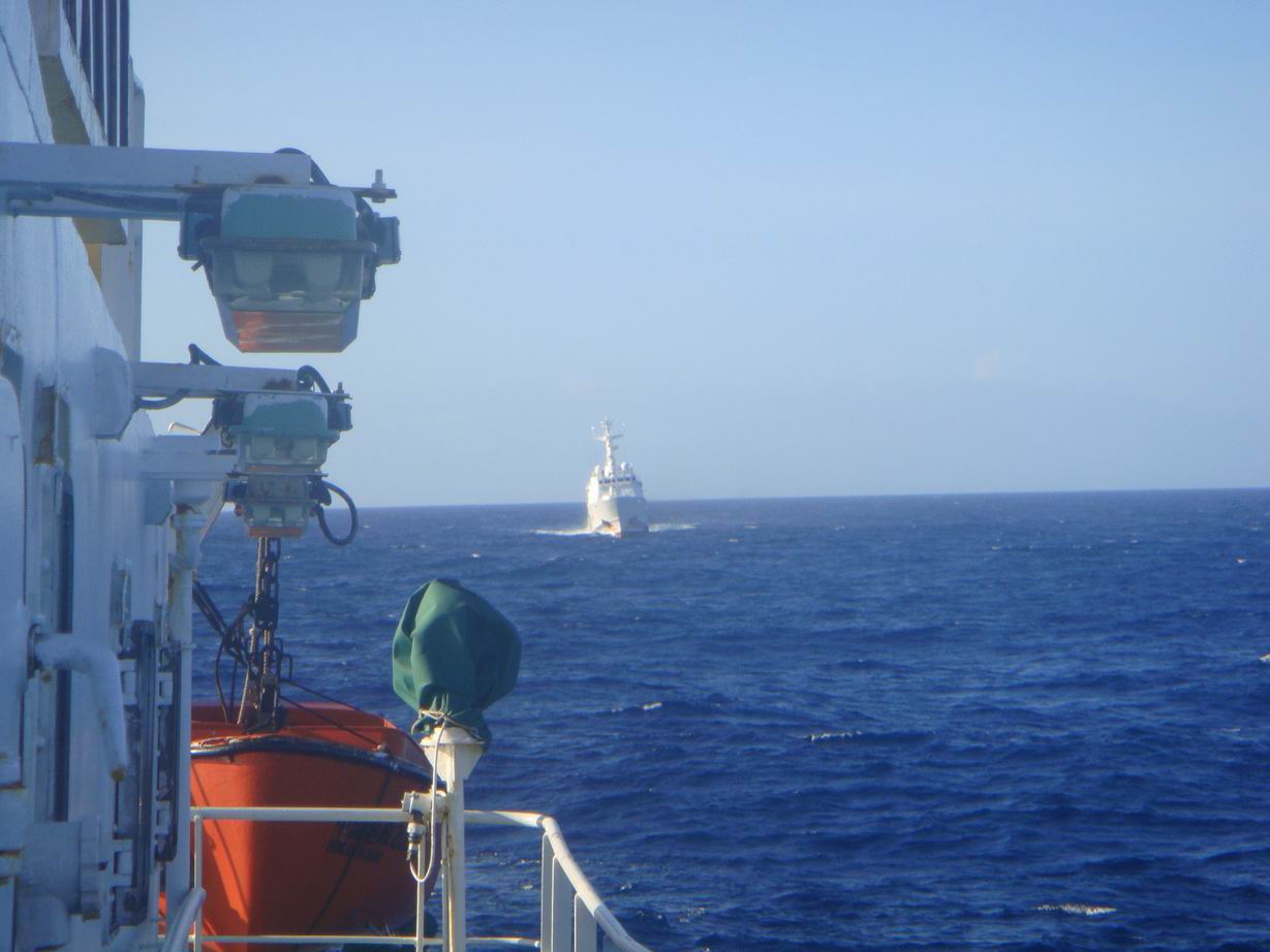 202船离钓鱼岛越来越近,而日本海上保安厅的大型巡逻船也增加到5艘。PL64船继续跟着“中国渔政202”船,另4艘巡逻船PLH06、PLH09、PL03、PL65则排成一字形,随202船的航向变化而动,始终挡在距离钓鱼岛12海里的所谓“警戒线”上,拦截着中国渔政船的去向。沈长岭船长告诉记者,船在深海上要真正停在一个定点上是很难做到的,即使停了,船也会随潮流漂移,而日本海上保安厅的这些大型巡逻船都装有先进的动力定位系统,可以准确地保持在海上的某个定点上,且这些舰船的瞬间提速都很快。“中国渔政202”船此后一直巡航到距离钓鱼岛12.8海里处。沈船长说,他们在护送“闽晋渔5179”返回晋江的途中还碰到过台湾的保钓船和台湾海巡署的船队,从之后的报道中了解到,它们被日本海上保安厅阻挡住的地方距离钓鱼岛还有十七八海里。