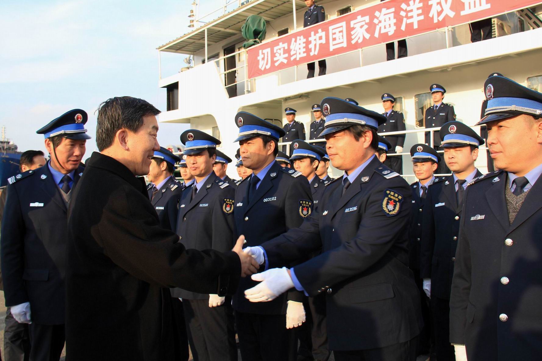 1月25日至26日,农业部牛盾副部长在上海考察调研渔业工作。1月25日一下飞机,牛盾副部长就到位于复兴岛的中国渔政东海总队,代表农业部党组亲切慰问一线渔政执法人员,并向他们及家人致以新春的祝福和诚挚的问候。牛盾副部长登上停靠在码头的中国渔政204船进行视察,详细询问了船舶性能、使用情况。他还听取了中国渔政东海总队关于维权护渔巡航工作的情况汇报。当听到巡航渔政船克服恶劣海况带来的困难,突破外方武装舰船的无理阻挠,机智、勇敢的与其周旋,展开有理有利有节的斗争,圆满完成钓鱼岛海域维权护渔任务时,牛盾副部长高兴地说:“东海区渔政局、中国渔政东海总队在钓鱼岛维权护渔工作中表现突出,在关键时候做到召之即来、来之能战、战之能胜,充分体现了特别能吃苦,特别能战斗,特别能奉献,特别有作为的中国渔政精神。”牛盾副部长要求东海区渔政局、中国渔政东海总队,在“十二五”期间继续发扬优良传统,抓好队伍建设,做好维权护渔工作,与时俱进、积极创新,做到精心设计、精心管理、精心领导,执行好、落实好维权护渔重任,对当前面临的一些困难,在中央的高度重视和有关部门的大力支持下,将逐步予以解决。
