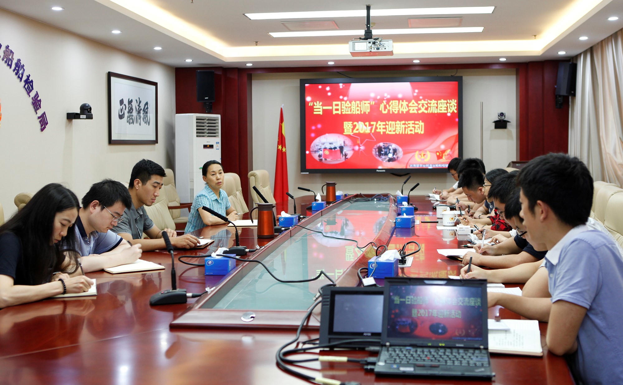 7月18日,农业部渔业船舶检验局团支部组织青年干部,就日前赴河北验船一线开展的“当一日验船师”活动进行心得体会交流,同时,为2017年新录用公务员举办了迎新活动。局内14名青年同志参加了活动,刘晴副局长出席座谈会。