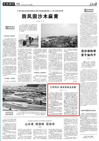 人民日报:江苏泗洪蟹塘栽草养殖生态蟹