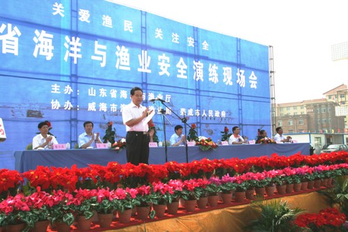 现场会由副厅长鲁小兵主持,荣成市政府负责人、渔民代表作了发言。省海洋与渔业厅厅长侯英民作了重要讲话,他指出举办以“关爱渔民,关注安全”为主题的“山东省海洋与渔业安全演练现场会”的目的,就是用直接面向渔民群众交流互动的方式,以渔业安全咨询、船员培训咨询、船东互保咨询、渔船节能减排咨询和海上救生、消防演练为重点,宣传国家关于渔业安全生产的方针政策和工作部署,普及渔业安全生产的法律法规和安全知识,为广大渔民群众提供及时周到的咨询服务,提高渔民安全生产的意识和能力,促进渔业经济的健康稳定发展。