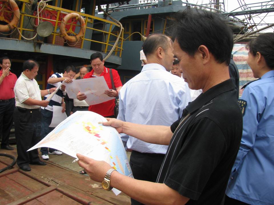 渔民认真阅读渔船防碰撞警示图