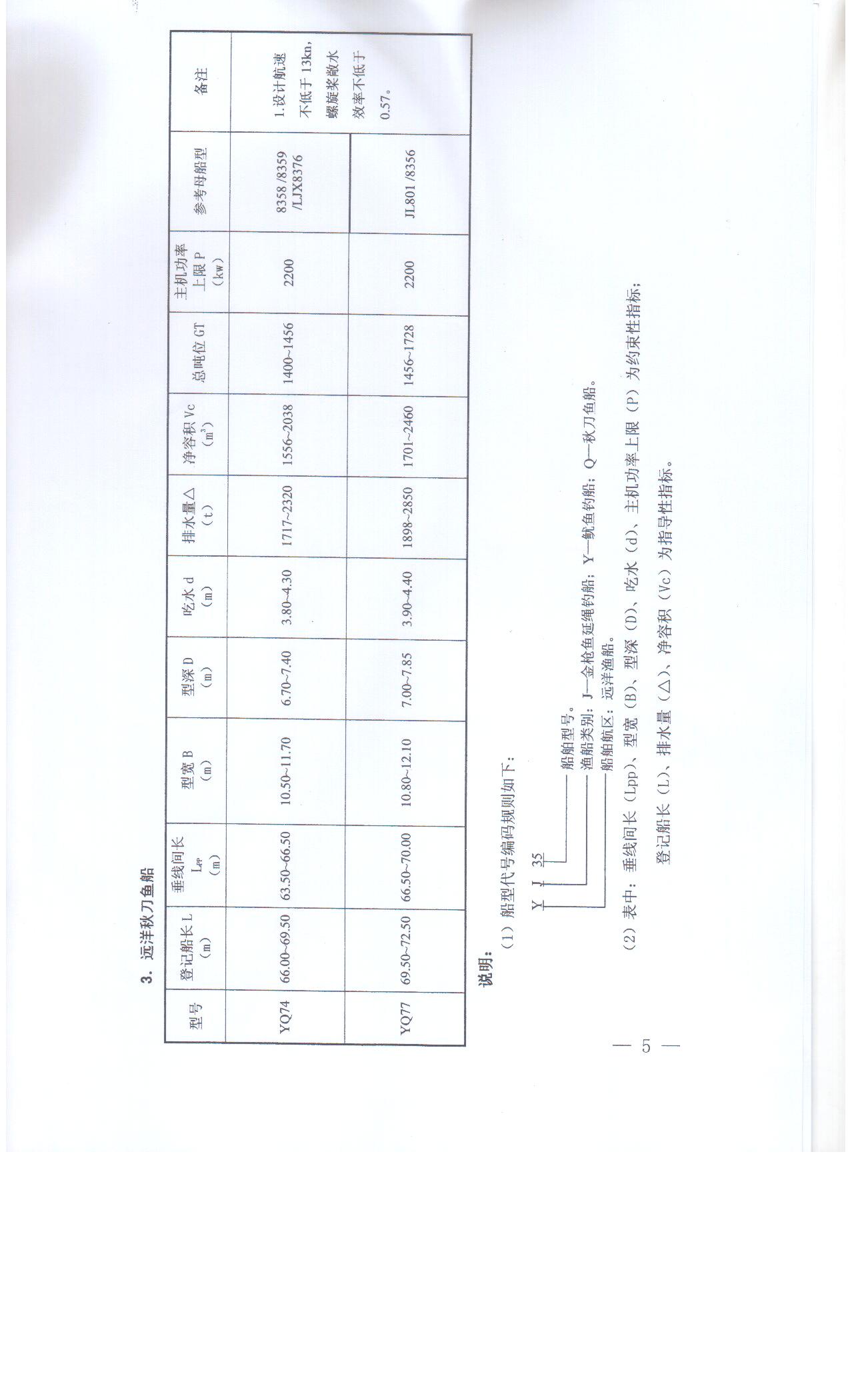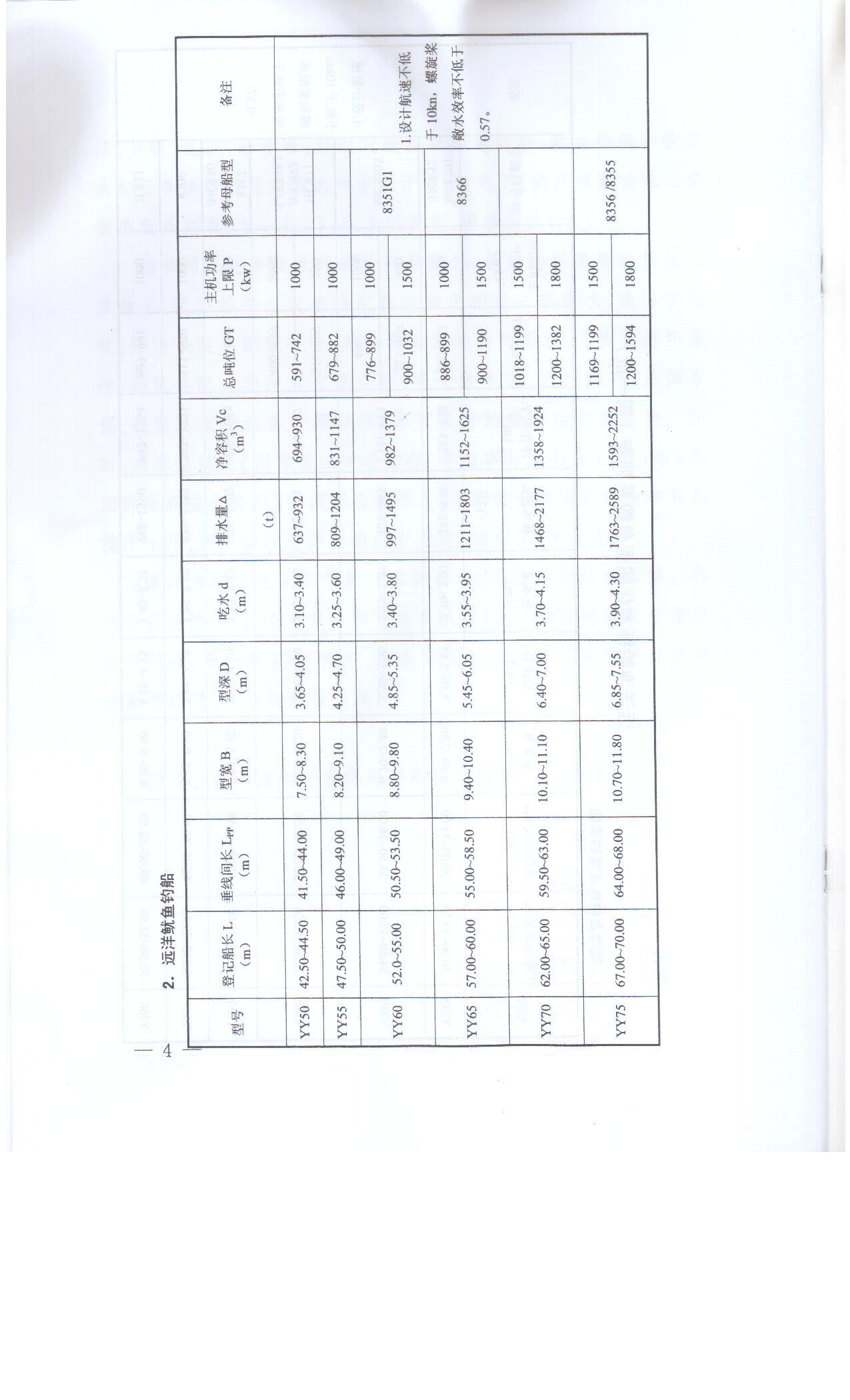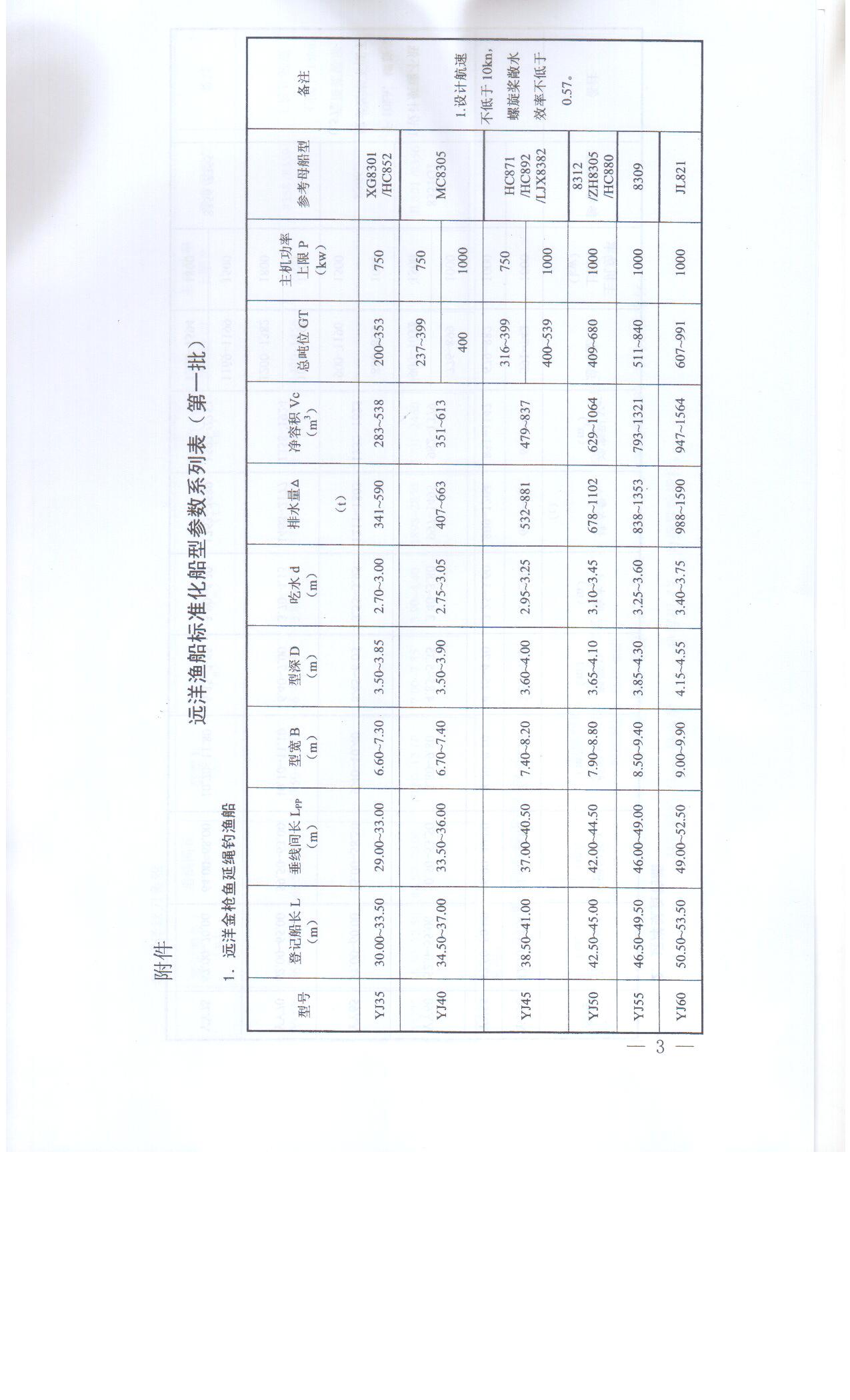 除参照上述参数系列表所列参数外,新建远洋渔船的稳性以及救生、消防等安全设备的配置应满足相关法规要求,确保安全性;防污染装备配置齐全,符合相关国际公约要求,具有良好环保性;船机桨配合和舱容布置合理,推进效率高,运行经济;总体布置、舱室及渔捞设备布局合理,具有良好的适渔性和适居性。同时,应尽量满足《国际劳工大会2006年海事劳工公约》和《1993年国际渔船安全公约》等国际公约要求,不断提升我国远洋渔船装备技术水平,逐步实现远洋渔船的专业化、标准化、现代化。