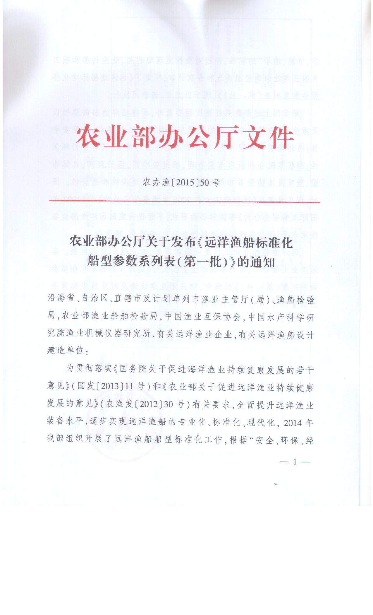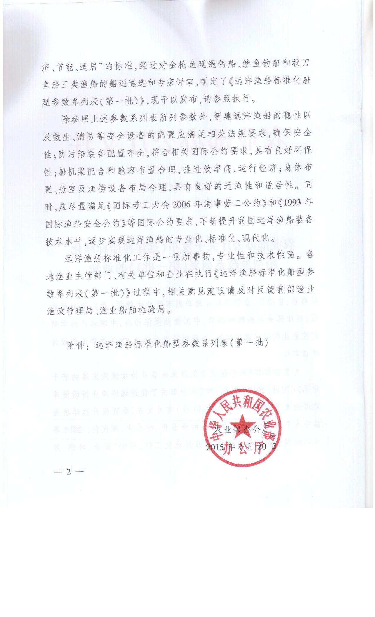 农业部办公厅关于发布《远洋渔船标准化船型参数系列表(第一批)》的通知
