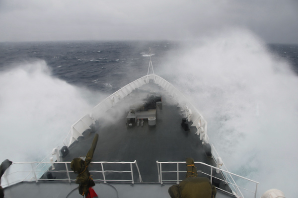 中国渔政310船顶着狂风巨浪在钓鱼岛海域巡航