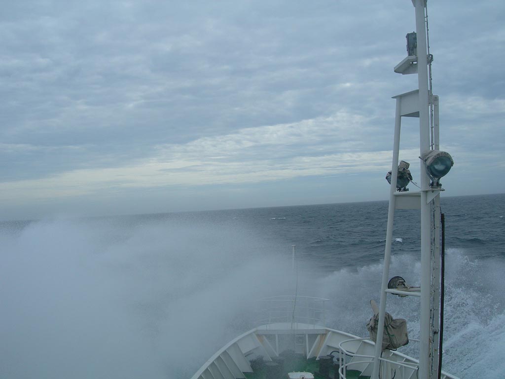 7月13日21时起,中国渔政118船航行海域风力从6级逐渐增强到7-8级,浪高也由2米增大到4米。渔政船一直是慢车顶浪航行,以减轻船的摇摆程度。即便是这样,也不时听到浪拍船头的巨响,常能听到室内物品滑落的声音。在驾驶室里值班的同志需手拉着操作台的扶手才能站稳,船随着海浪上下波动,每当大浪撞上船头,溅起的浪花会从驾驶室上面飞过。