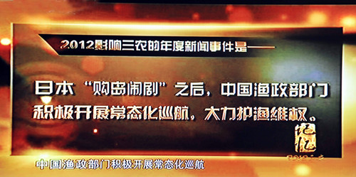“中国渔政积极开展钓鱼岛海域常态化巡航,大力护渔维权”被评为央视2012?三农记忆十大年度三农新闻事件