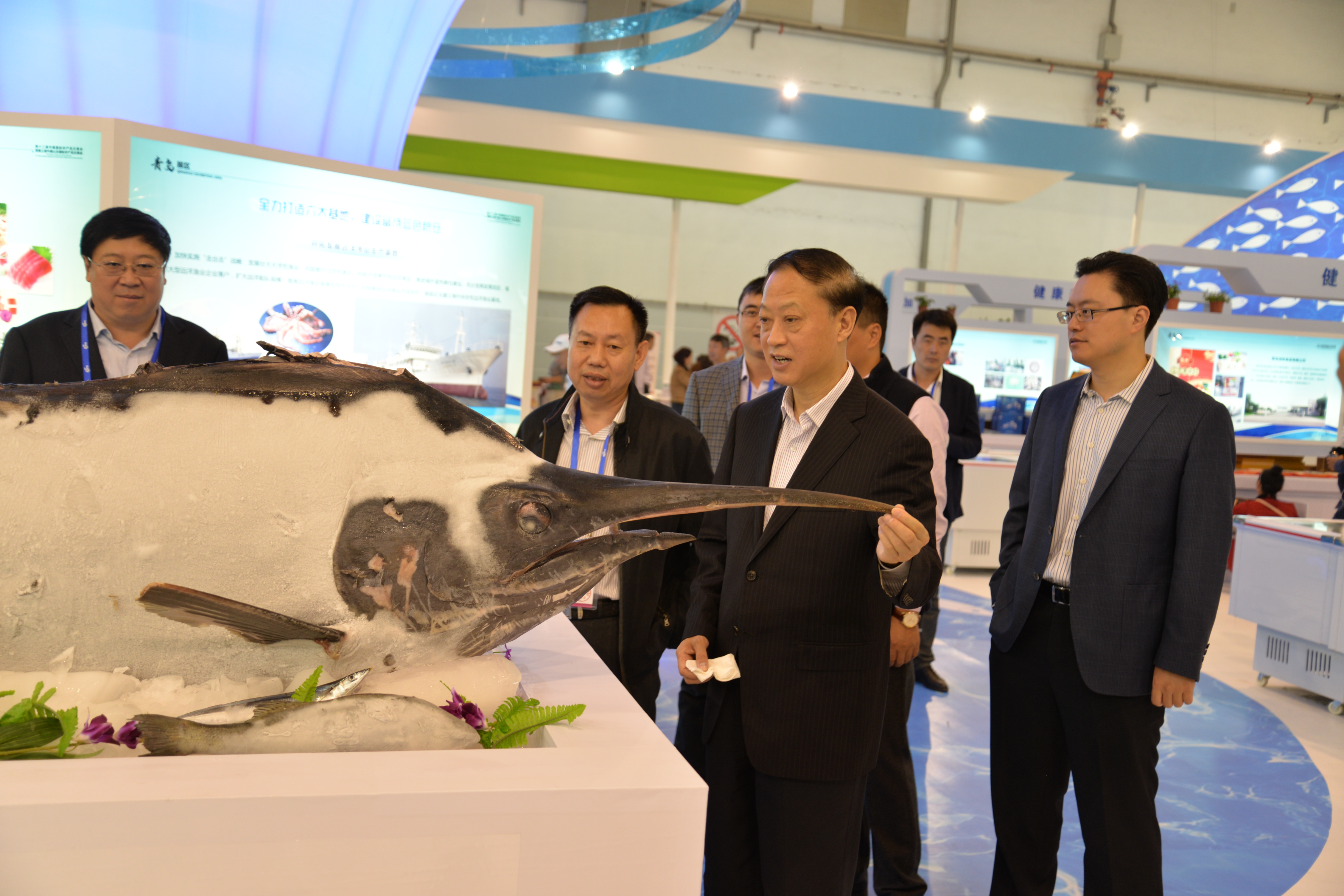 青岛鲁海丰食品集团有限公司展出的重49.5公斤,价值约60万元,可以说是本届农交会最贵的鱼;同时展出的长3米,重约200公斤的剑旗金枪鱼是本届农交会最重和最长的鱼,受到了观众的一致惊叹和好评。青岛金海富源海洋实业有限公司、青岛海泉崂山特色水产品有限公司和青岛海壬水产种业科技有限公司搭建的水族箱,生动展示了我市渔业健康养殖、海洋牧场建设和水产良种繁育等方面的蓬勃发展。青岛中泰远洋渔业有限公司和青岛龙和食品有限公司等企业进行秋刀鱼、海鲜水饺和三文鱼的现场品尝,吸引了展区的巨大人气,也向观众展示了我市水产品的优良品质。