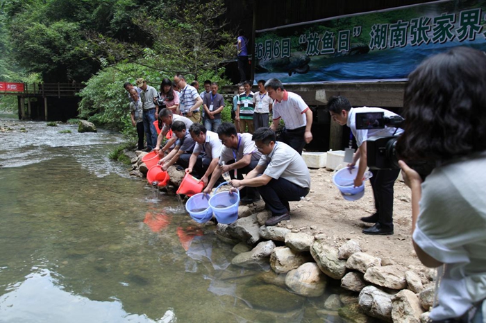 6月6日“全国放鱼日”,在美丽的湖南张家界大峡谷,数十名中外游客共同见证了120尾带着芯片的张家界大鲵游向它们的新家。