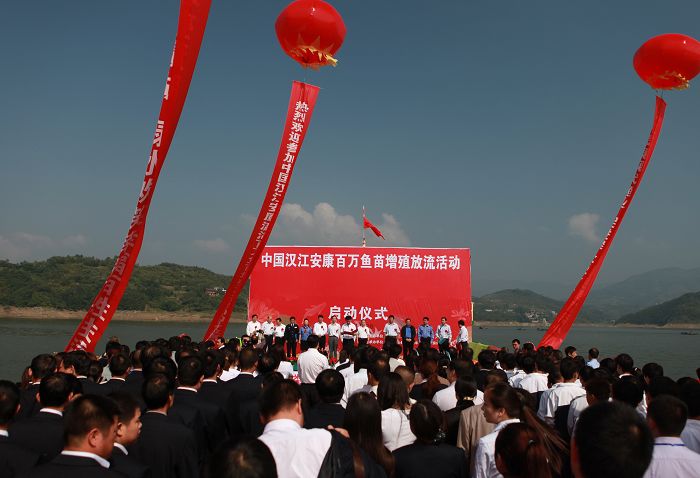 9月28日上午,由陕西省水利厅、安康市人民政府联合举办,陕西省渔业局、安康市水利局、汉滨区人民政府承办的“中国汉江安康瀛湖水库百万鱼类增殖放流活动启动仪式”在安康市汉滨区流水镇码头举行。农业部东海区渔政局副局长、长江流域渔业资源管理委员会副主任宋志俊、陕西省水利厅厅长王锋、副巡视员左占清、安康市委书记方玮峰、市长郭青、副市长邹顺生等领导和省水利厅有关处室、省渔业局、省船检局、省水产工作总站、省水产研究所以及安康市委、市政府有关部门、汉滨区主要负责人、流水镇中学学生、省市新闻媒体等共400多人参加了此次增殖放流活动启动仪式。