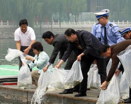 为进一步促进社会公众爱护首都生态环境和保护渔业资源的意识,迎接绿色奥运,2008年5月16日,农业部渔业局、北京市农业局和北京市水务、园林部门联合在历史悠久、中外闻名的北海公园举办“渔业生态净水迎奥运”主题宣传活动。活动共向北海和什刹海放流鲢、鳙、草鱼6.5万尾。